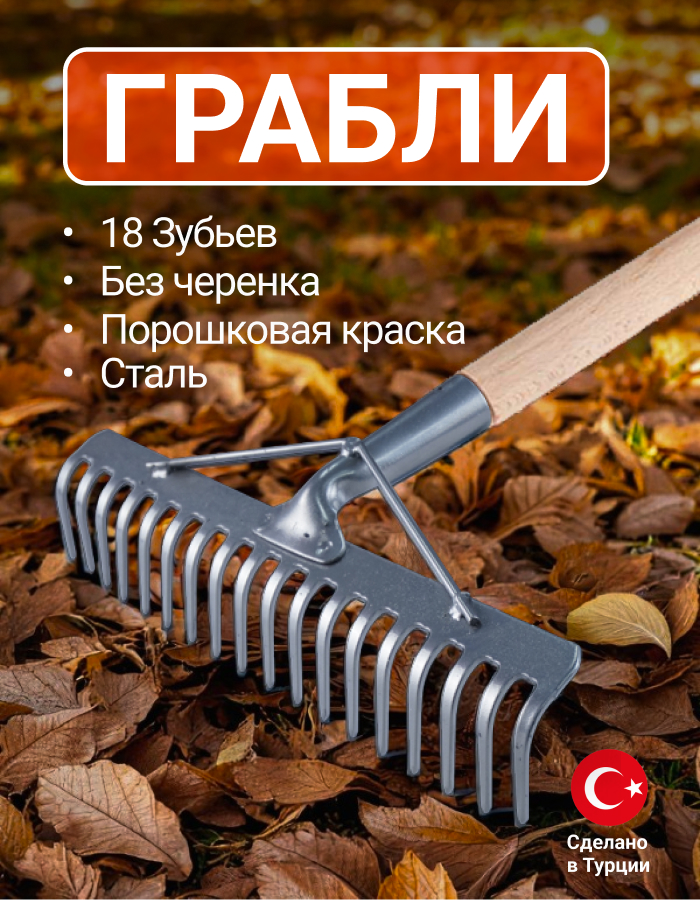 - Функциональность: 18 зубцов оптимальны для мелкого мусора. Плоская тыльная сторона удобна для разравнивания грядок.