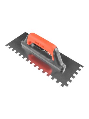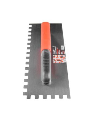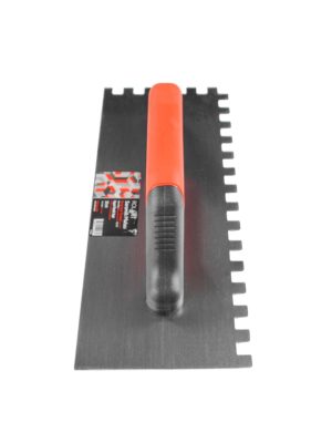 Матовый черный корпус с серыми вставками придает гладилке стильный и современный вид, а эргономичная форма обеспечивает комфортное использование. Зубчатый край шпателя с шагом 10×10 мм позволяет наносить клей равномерным слоем нужной толщины, что гарантирует надежное сцепление материалов.