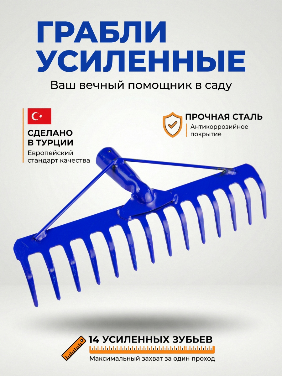 Основное преимущество этой модели — высокая производительность. За счёт увеличенной ширины и 14 зубьев вы сможете убрать листву, разрыхлить почву или выровнять грядку в разы быстрее, чем обычными граблями. Металлическая конструкция гарантирует долговечность и устойчивость к нагрузкам, а возможность отдельно подобрать черенок нужной длины (диаметр 28-30 мм) делает работу максимально комфортной.