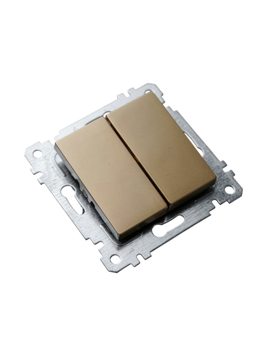 Выключатель двухклавишный – это идеальное решение для управления освещением в вашем доме или офисе. С его помощью вы сможете комфортно и легко контролировать несколько источников света одновременно, что делает его незаменимым элементом в любом интерьере. Золотистый цвет выключателя позволяет ему органично вписываться в различные дизайнерские решения, создавая аккуратный и современный вид.