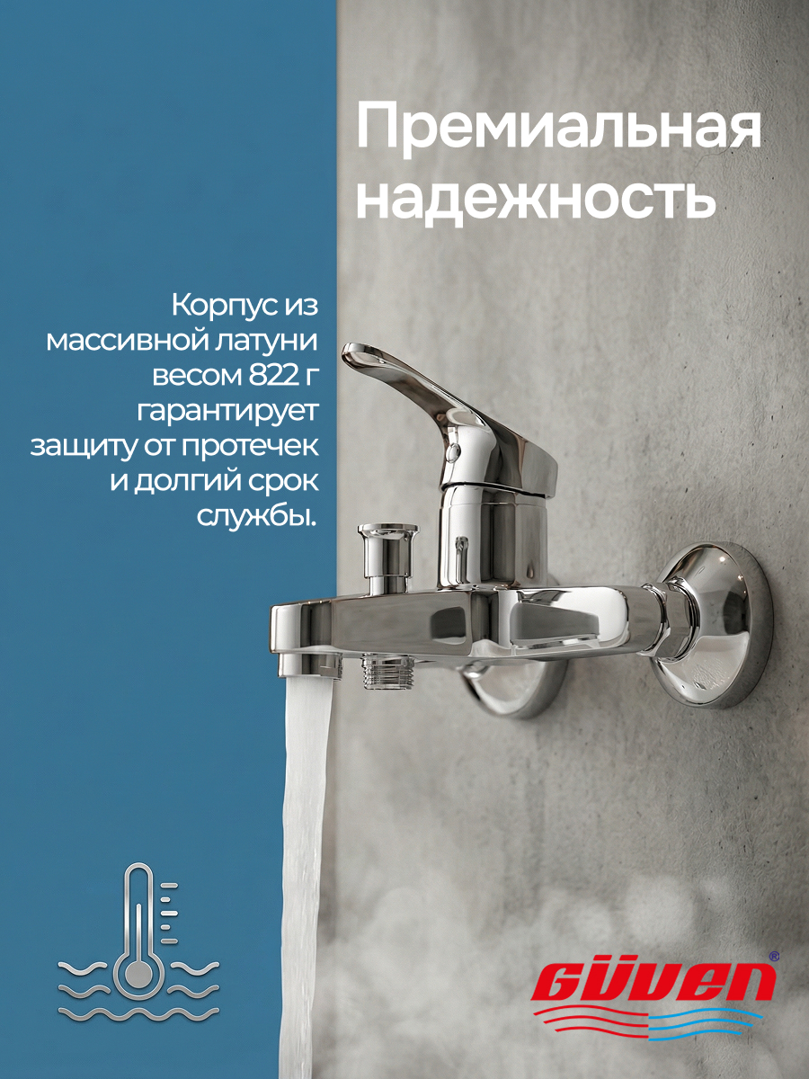 Гарантия долговечности: Утолщенный излив и массивный вес изделия (822 грамма) подтверждают, что в основе конструкции лежит прочная латунь, устойчивая к гидроударам и коррозии.