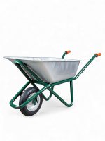 Конструкция тачки выполнена из прочного металла, что гарантирует долговечность и устойчивость к износу. Два надежных колеса с шипованными шинами обеспечивают отличную маневренность и проходимость даже по неровной или мягкой почве.
